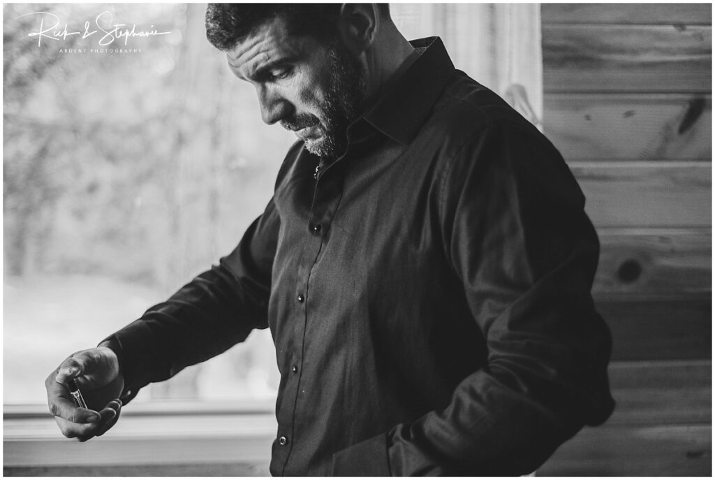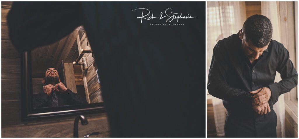 EJ got wedding ready in an amazing mountain cabin near the venue. He chose all black for his attire which had a luxury feel to it.