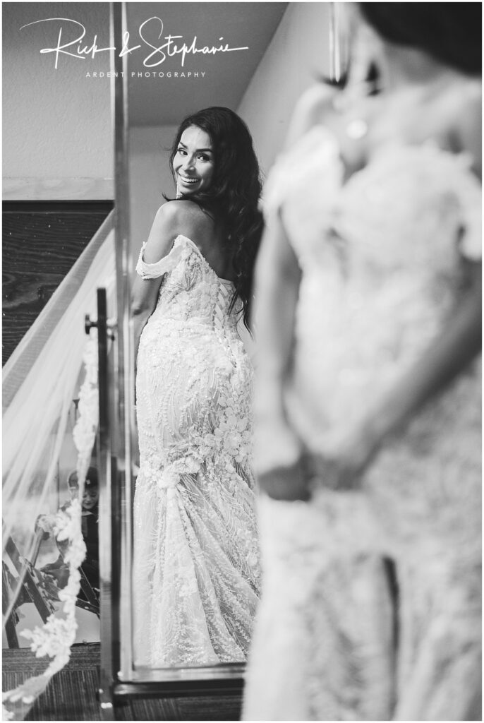 We see a lot of custom hangers with wire spelling the bride’s new last name. Ruby’s wedding dress hanger was personalized but maybe even more classic and timeless. Oh and that dress though, stunning!